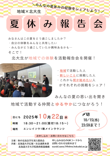 【10/22(火)開催!地域×北大生 夏休み報告会 参加者募集!~北大生の様々な地域での体験を聞いてざっくばらんに交流しよう~】
